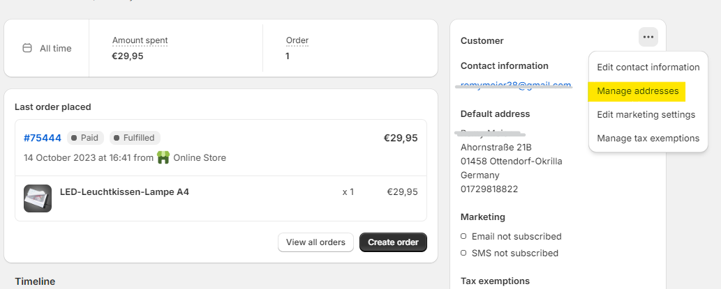 IMPORTANT: When updating a customer’s address, make sure to adjust it not only in the order but also in the customer’s profile. This helps prevent future issues. To do this, go to the customer’s main profile and select "Manage addresses."