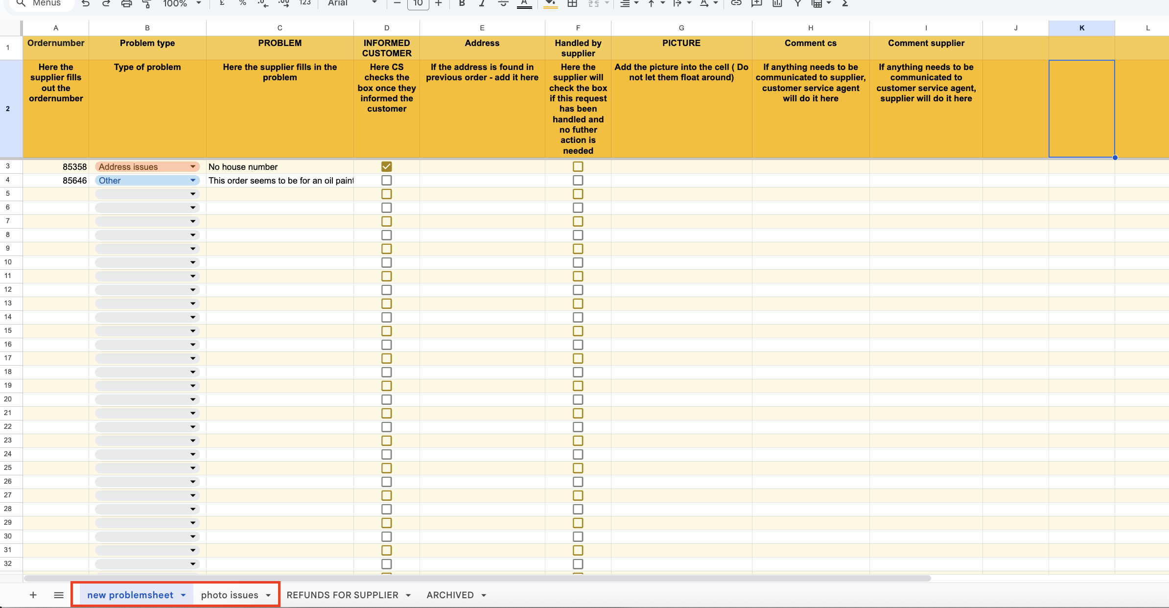 You will need to contact the customer concerning these problems and update the supplier via internal notes in Gorgias. You can also mark that it is done in the problem sheet.